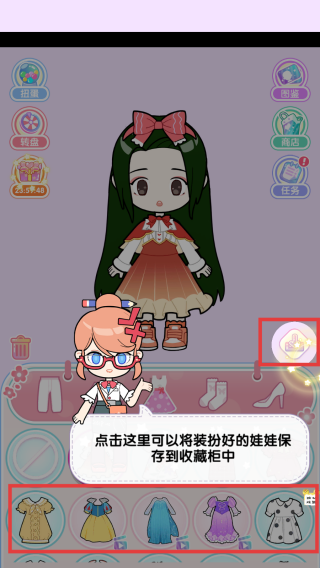 2、点击下方服饰,可以给娃娃换装,换好后点击存储按键即可保存。