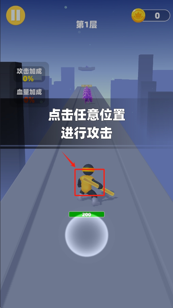 1、点击屏幕中央的 “点击屏幕开始游戏” 文字区域,进入游戏第 1 层开始挑战。