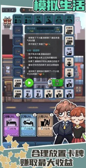4、休闲工作生活模拟器,丰富的游戏玩法,可以在你的24小时生活中插入动作卡,合理分配你的时间,获得更多的收入。