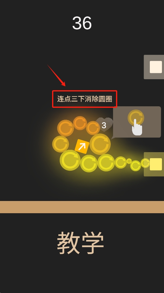 2、在游戏界面,看到提示“连点三下消除圆圈”,点击黄色圆圈三次,即可消除并得分。