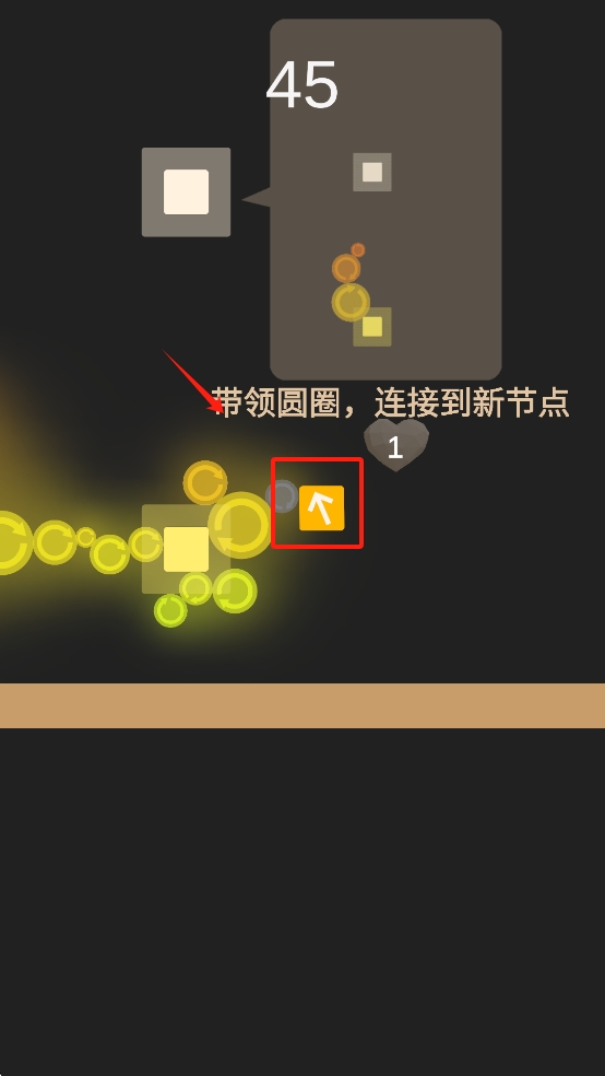 3、看到提示“带领圆圈,连接到新节点”,拖动带有箭头的黄色圆圈,连接到目标位置。