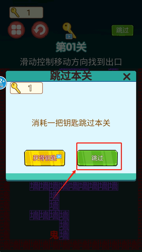 3、若卡关,可点击“跳过”按钮,消耗钥匙跳至下一关,继续冒险。