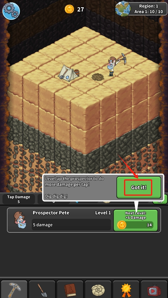 3、当有足够的金币后,点击“升级”按钮,提升角色的挖掘能力。