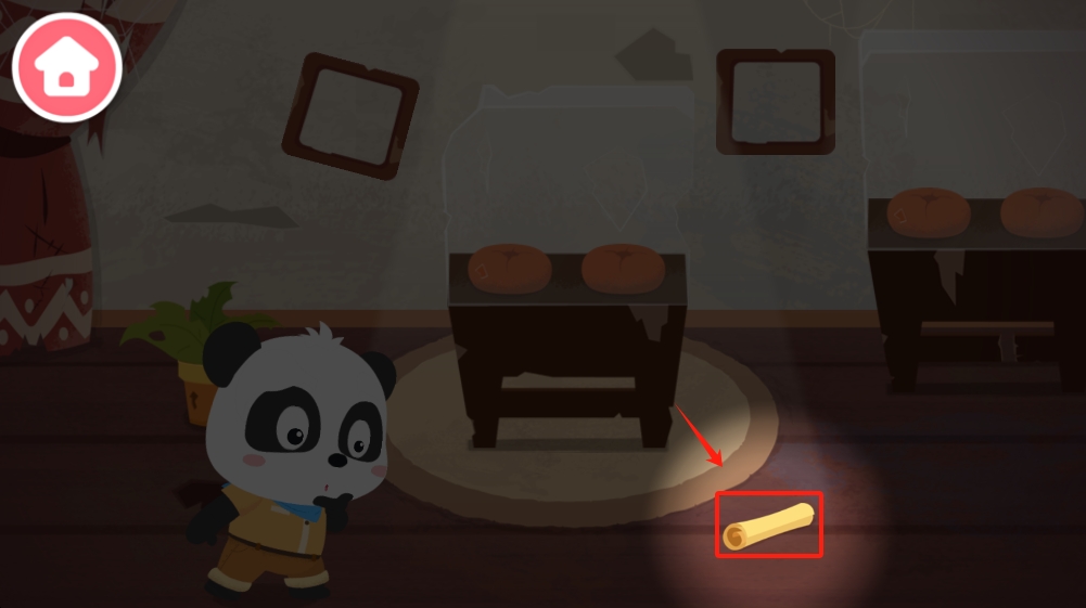 1、在房屋场景中,引导角色走向并点击地上闪光的卷轴,触发下一步任务。