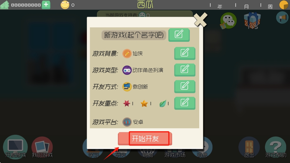 3、填写游戏信息,如名称、背景、类型等,点击“开始开发”按钮。