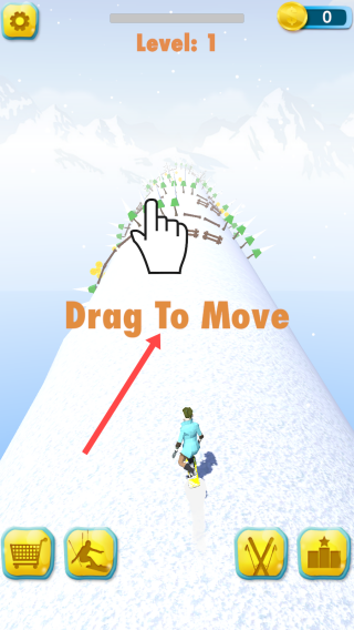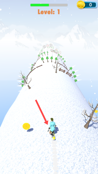 2、在滑雪过程中,操控角色按箭头方向前进并收集金币等物品。