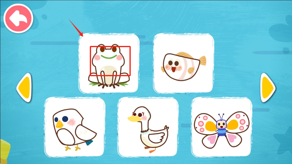 2、点击左上方青蛙卡片,选择动物主题进入填色界面。