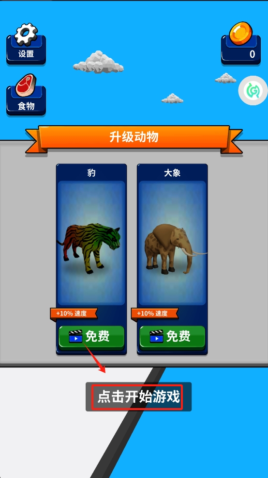 1、选择并升级你的动物,点击“开始游戏”按钮进入游戏。