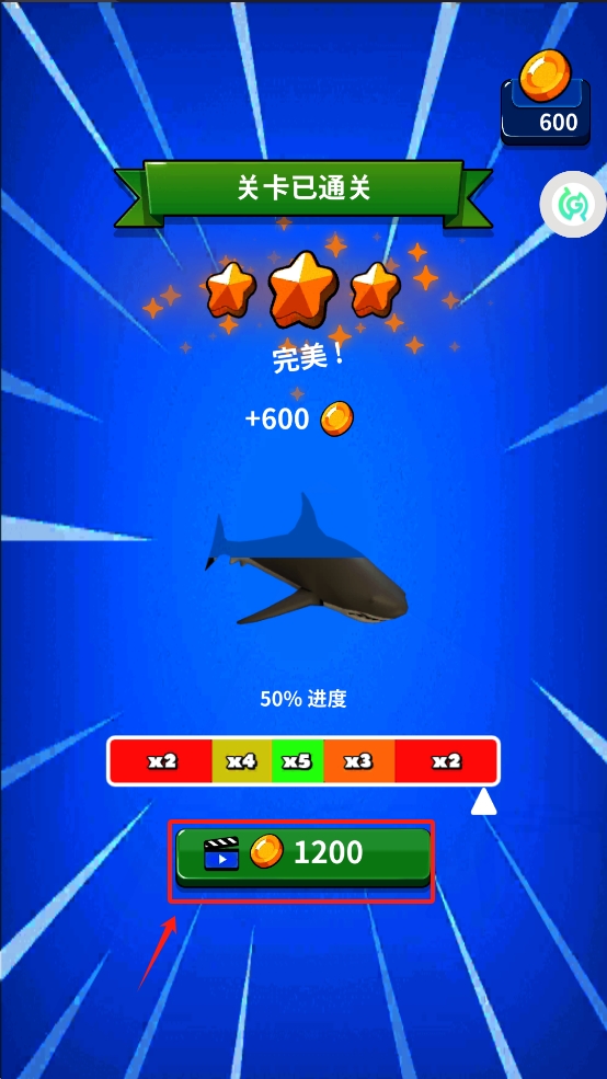 3、通过完美通关获得金币奖励,点击“1200”按钮领取。