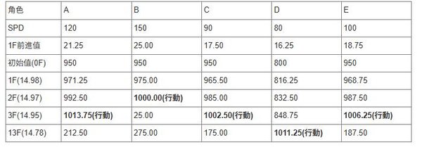 当SPD高于90时初始行动条都会是上限值950,而角色需超过1000行动条才可行动;以下表为例,实际上的行动顺序为B>A>C>E>D
