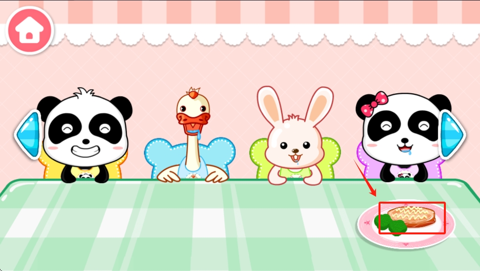 3、将汉堡放在桌子上,点击汉堡投喂给小熊猫,让它吃上午饭。