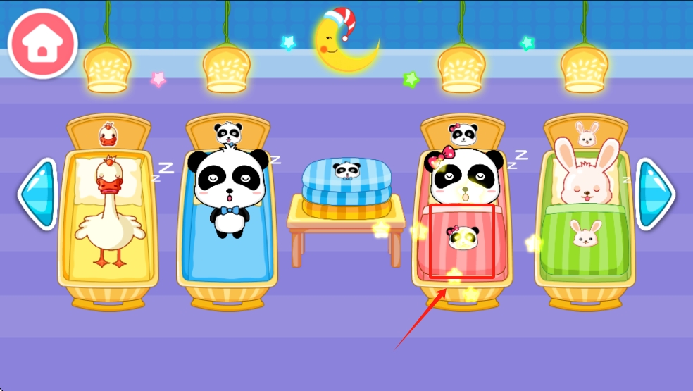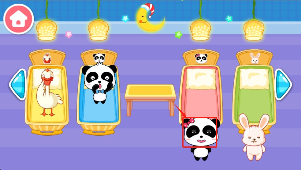 2、观察被子的颜色和图案,给小动物们盖上有它们头像标志的被子。
