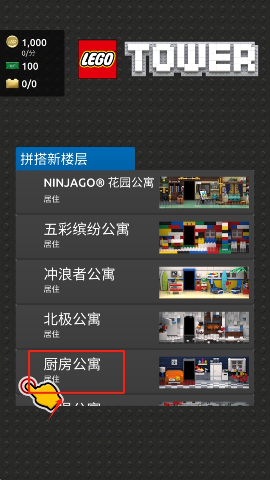 3、从列出的楼层选项中,点击选择心仪的公寓楼层,如“厨房公寓”,完成新楼层的添加。
