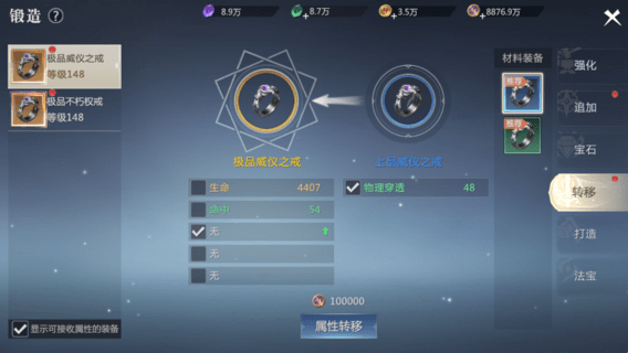 1、转移可以将材料装备上的附加属性,转移至当前穿着的装备上。
