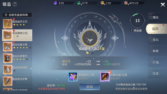 消耗不同等级的魔魂晶石及辅助材料,即可进行追加。