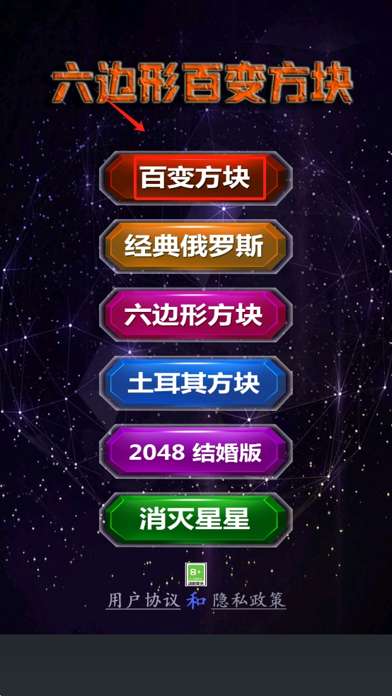 1、在游戏主界面,点击“六边形方块”进入游戏模式选择。