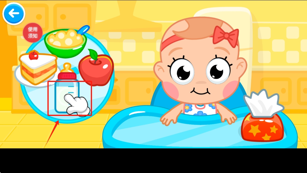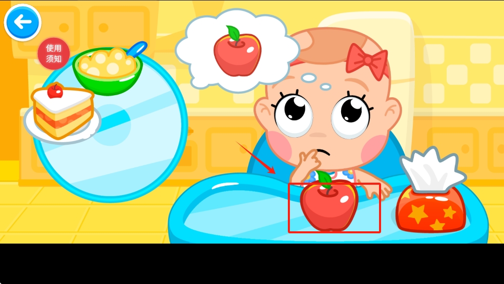 2、点击苹果图标,将苹果喂给宝宝。观察宝宝的反应,确保她喜欢。