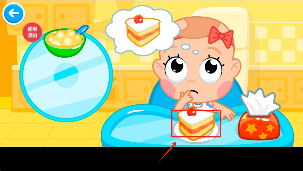 3、点击蛋糕图标,将蛋糕喂给宝宝。注意宝宝的表情,了解她的喜好。