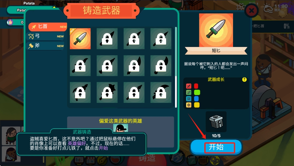 2、选择你想要铸造的武器类型,例如“短匕”,然后点击“开始”按钮。