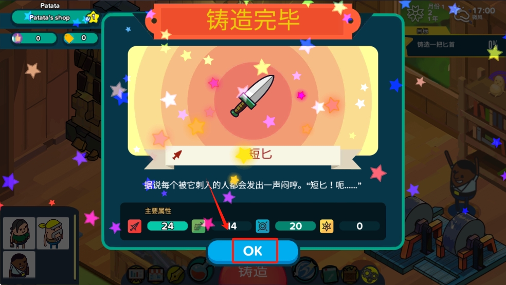3、铸造完成后,查看武器属性并点击“OK”按钮确认。这是完成武器铸造的最后一步。