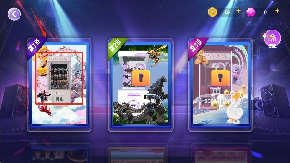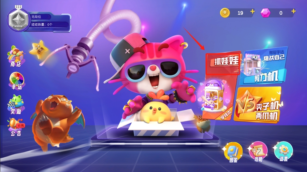 1、点击游戏主界面的“抓娃娃”按钮,进入抓娃娃机选择界面。