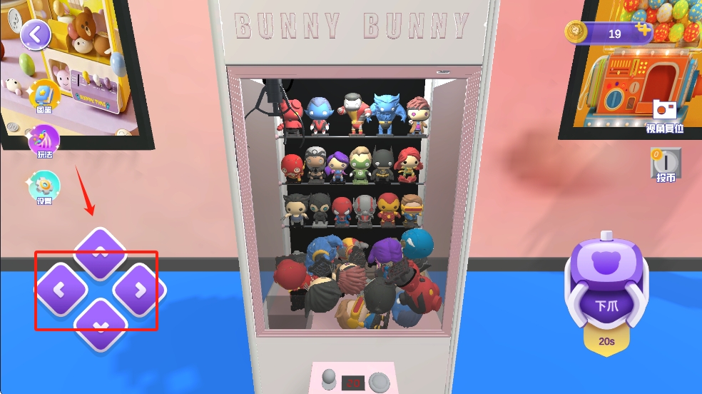 3、在抓娃娃机操作界面,使用方向按钮移动爪子,对准想要抓取的娃娃后,点击“下爪”按钮。