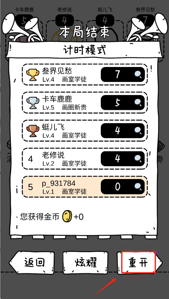 3、在游戏结束界面,查看排名和得分,点击“重开”按钮重新开始游戏。