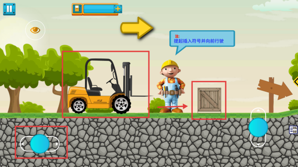 3、拖动左下方按键,让叉车前进并推动木箱到指定位置即可。