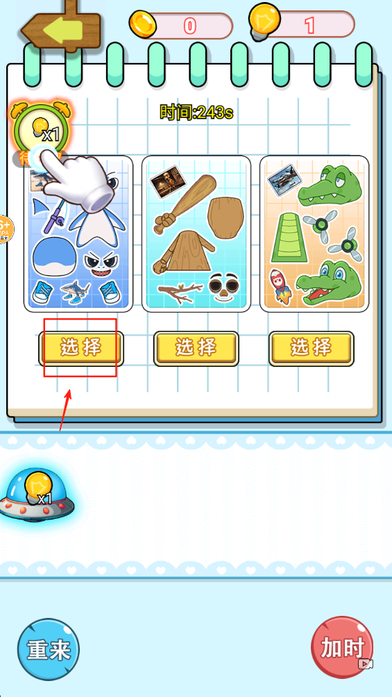 3、在限定时间内,从三个选项中选择与题目匹配的正确贴纸。