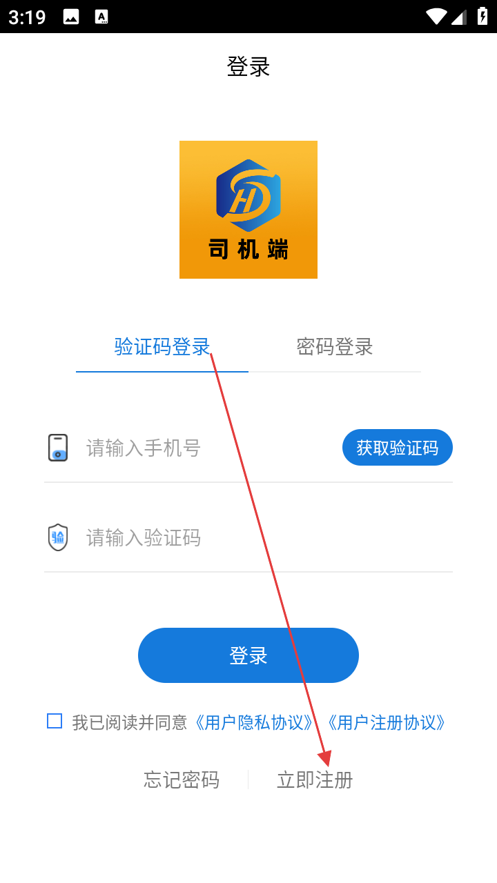 2、在登录页选【立即注册】,进入司机端账号创建流程。
