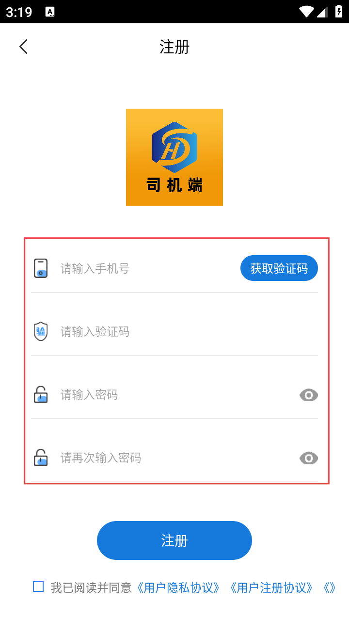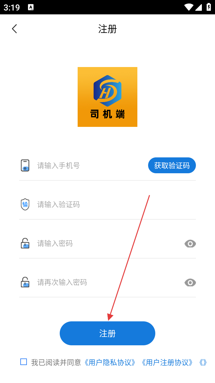4、填完注册信息,勾选协议后点【注册】按钮,完成司机端账号创建。