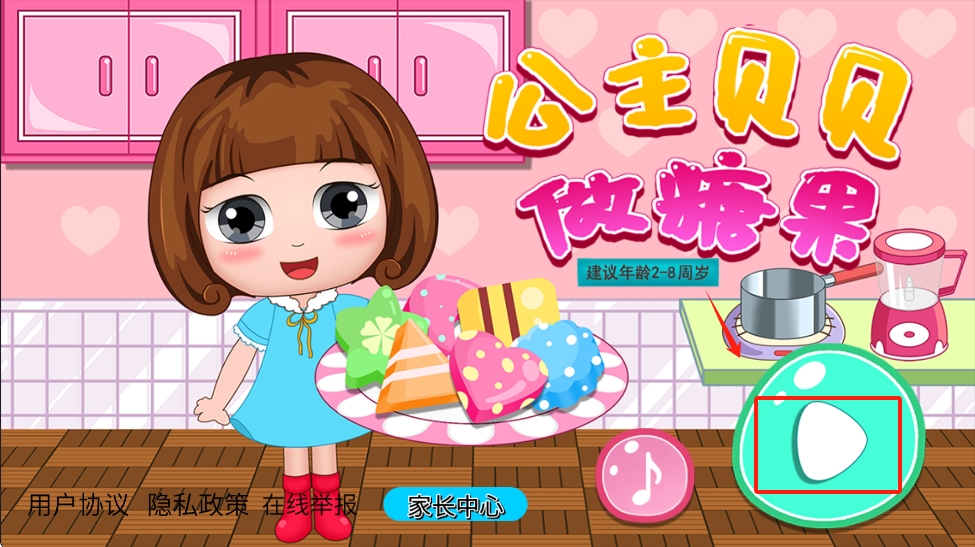 1、在首页点击开始游戏按钮,进入2-8岁甜蜜糖果工坊。