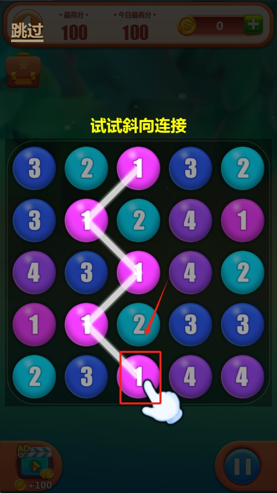 3、探索斜向连接的可能性,斜向连接同样可以消除数字并得分。