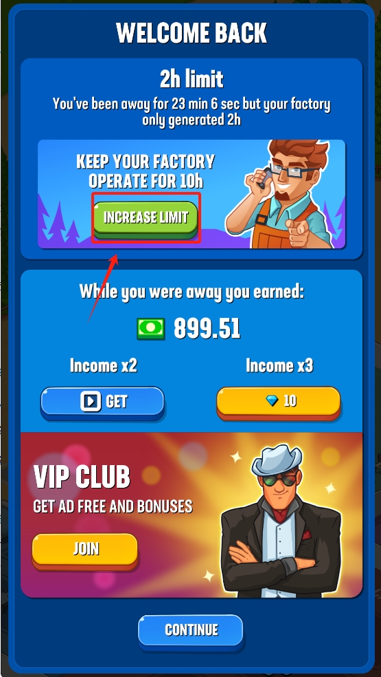1、点击“INCREASE LIMIT”按钮,提升工厂离线生产时间,获得更多资源。