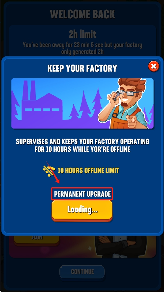 2、点击“PERMANENT UPGRADE”按钮,永久提升工厂离线时长至10小时。