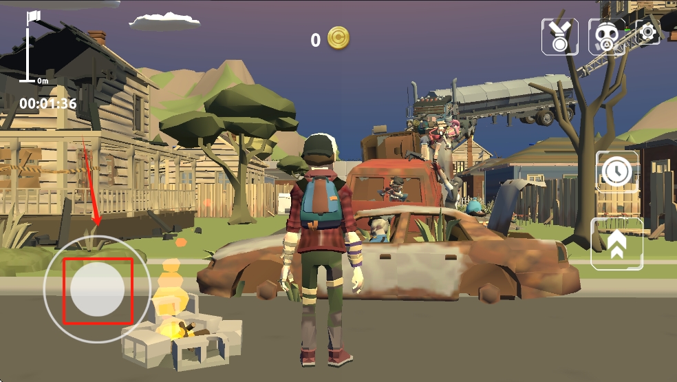 1、通过点击左下角的虚拟摇杆来控制角色移动。探索周围环境,寻找资源和线索。