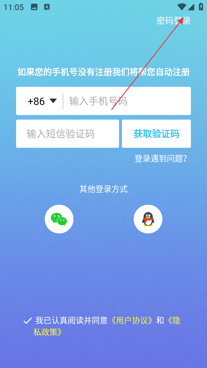2、在登录页,若想用密码登录,点击右上角【密码登录】,切换登录模式。
