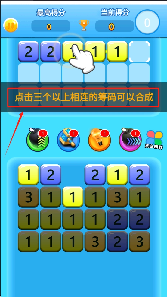 3、合成筹码以获得更高分数。点击三个以上相连的筹码进行合成,获取更高级别的筹码。