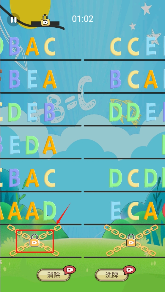 3、观察游戏界面中的锁链图案,找到可解锁的字母区域,进行字母消除。