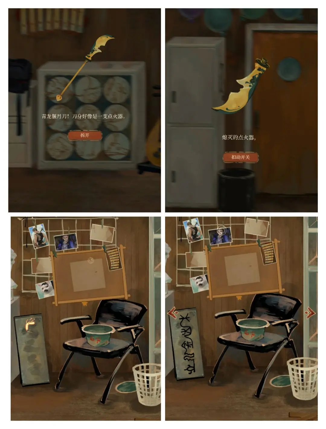 然后拆开青龙偃月刀获得锤子和点火器,点燃点火器,在左下角使用可以获得密码锁的密码。