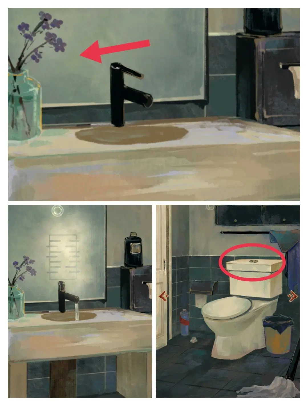 然后进入卫生间,向左滑动(划重点)打开水龙头的热水,水雾可以显出一个图案,用在马桶盖子打开以后拿出来的盒子上(忘记截图)。