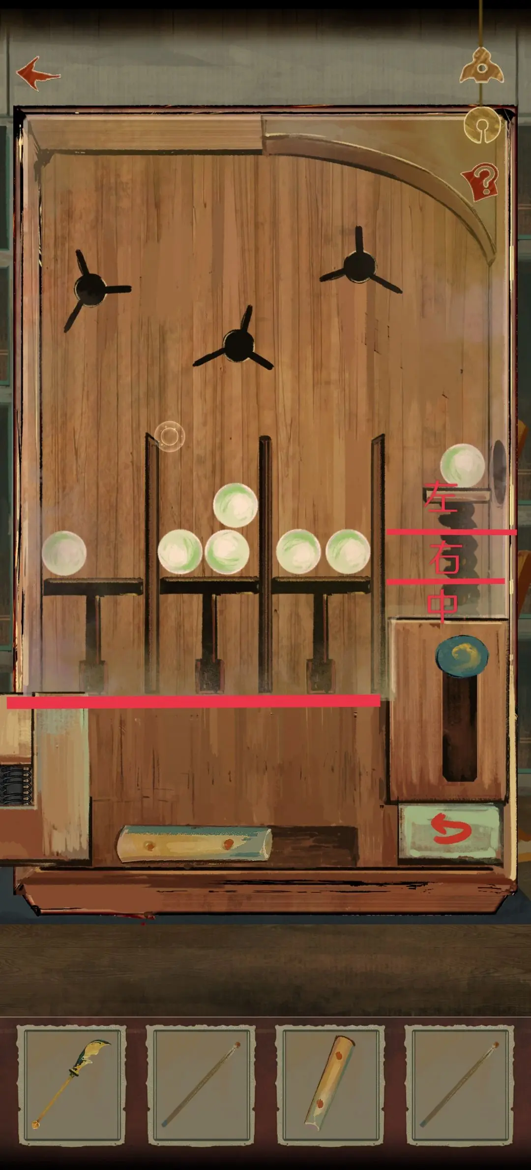 关于下面抽屉里的装置,是需要将小球弹入保证三个隔板在同一水平面(如左下红线所示),从左到右分别为1个,3个,2个小球。我大概试了一下,不同弹簧压缩的范围可以弹进不同格子(但是因为范围比较小而且可能会失误,所以运气不好就跳过吧)。