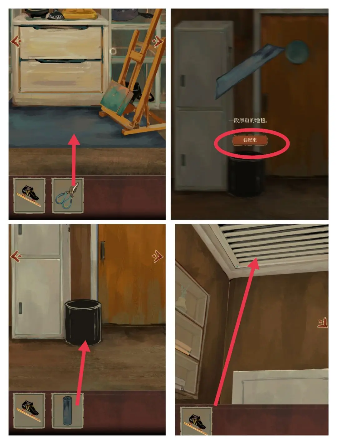 用剪刀剪下被压住的毯子,卷起来以后放进垃圾桶拿来垫脚,就可以够到天花板然后用冰刀拧开螺丝获得关于瑶山的文件。