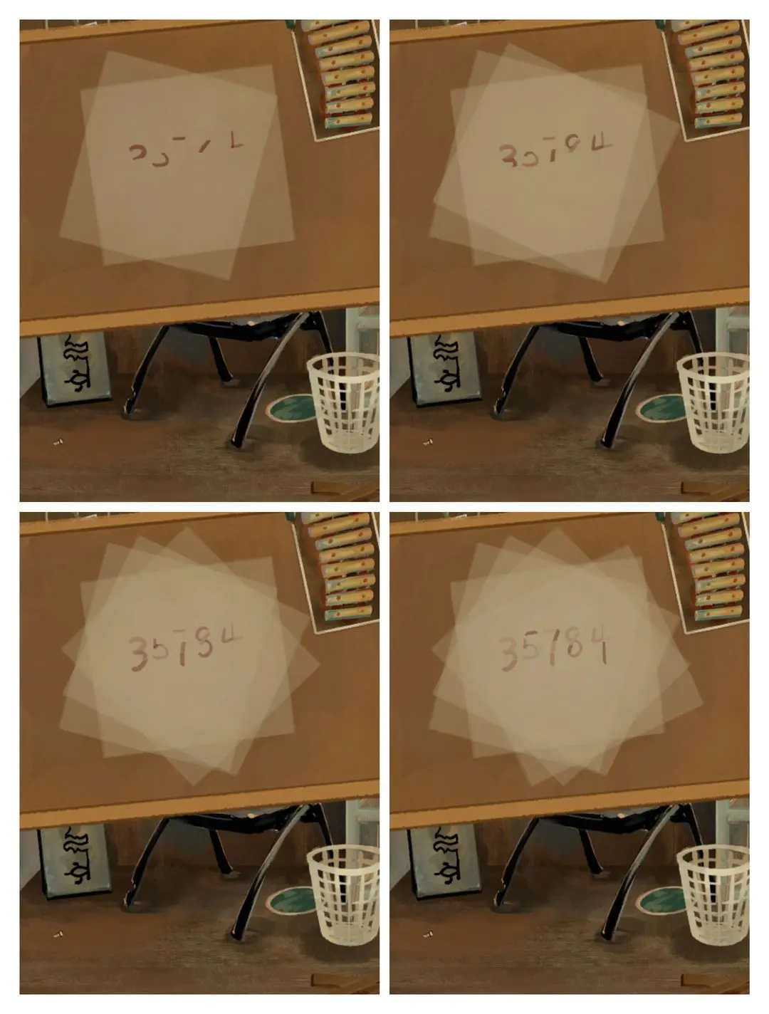 然后逐张将描红纸拖拽到白板上,旋转拼合后获得一串数字35784,根据旁边木琴照片我们可以知道是木琴的线索。