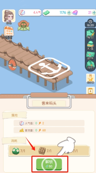 3、点击“解锁”按钮,解锁客来码头,提高客流量,增加店铺人气值。