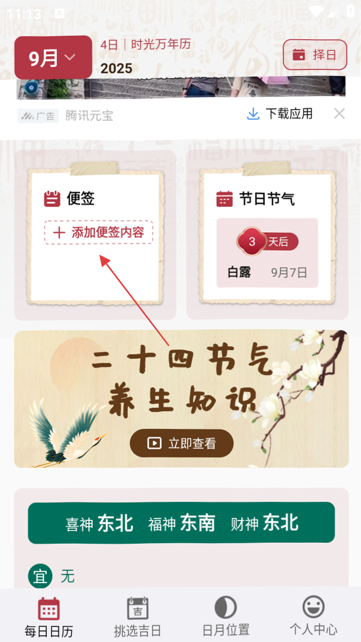 1、打开“时光万年历”,在首页点击【便签】板块中的【添加便签内容】。