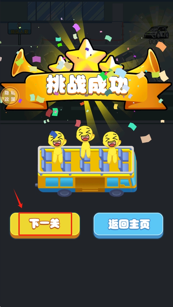 4、在挑战成功后,点击“下一关”按钮,继续进行下一关卡的挑战。