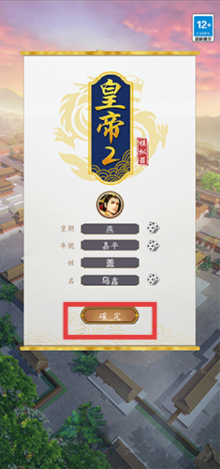 1、开局可以自定义【皇朝】、【年号】、【姓】、【名】,完成后点击【确定】。