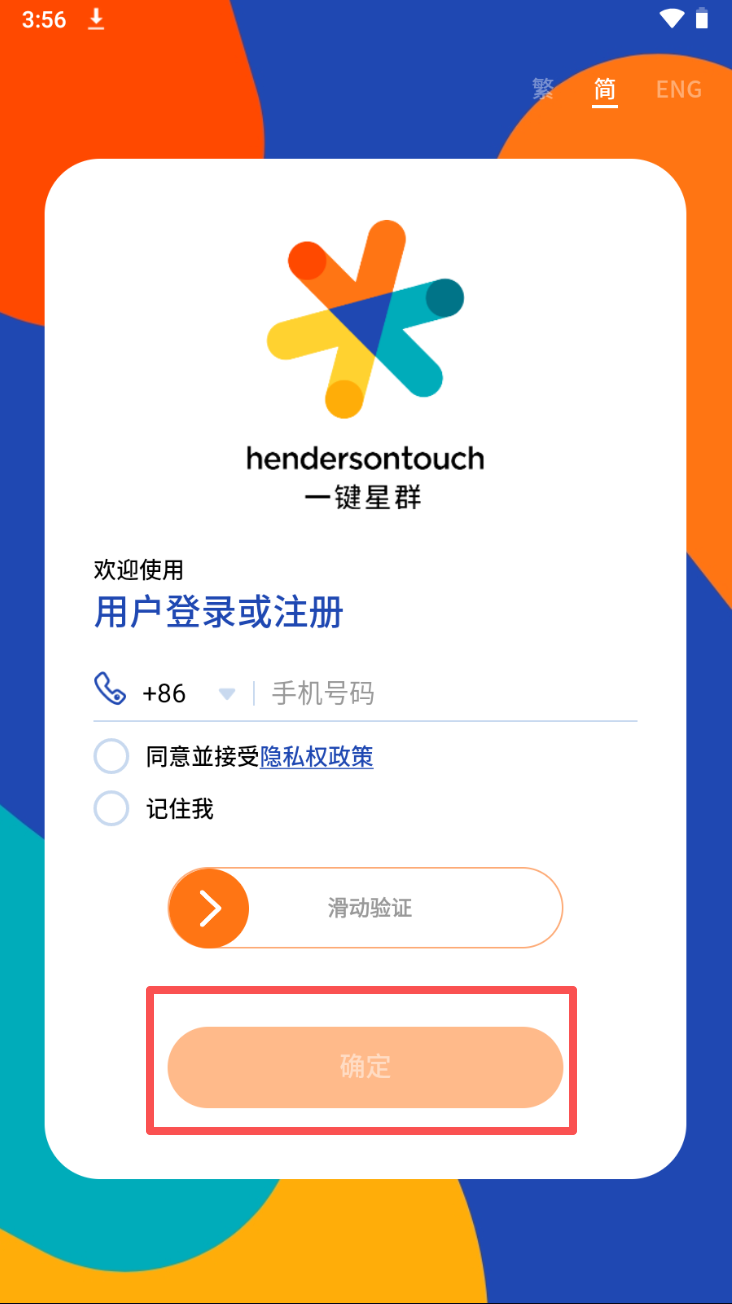 3、在登录或注册页面,填写手机号码,完成验证后点击 “确定”。