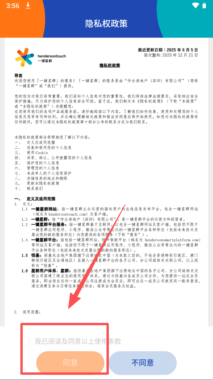 1、阅读隐私权政策后,勾选 “我已阅读及同意以上使用条款” 并点击 “同意”。